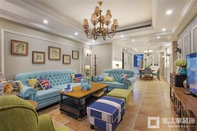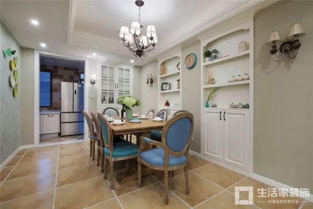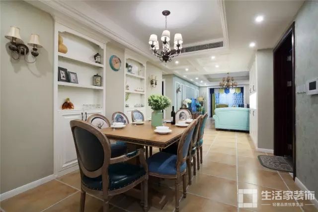 ▲略带复古木色的家具,与仿古砖的色彩呼应,避免纯粹蓝色带来的冷的视觉,与阳光沙滩蓝天白云的干净更为接近。