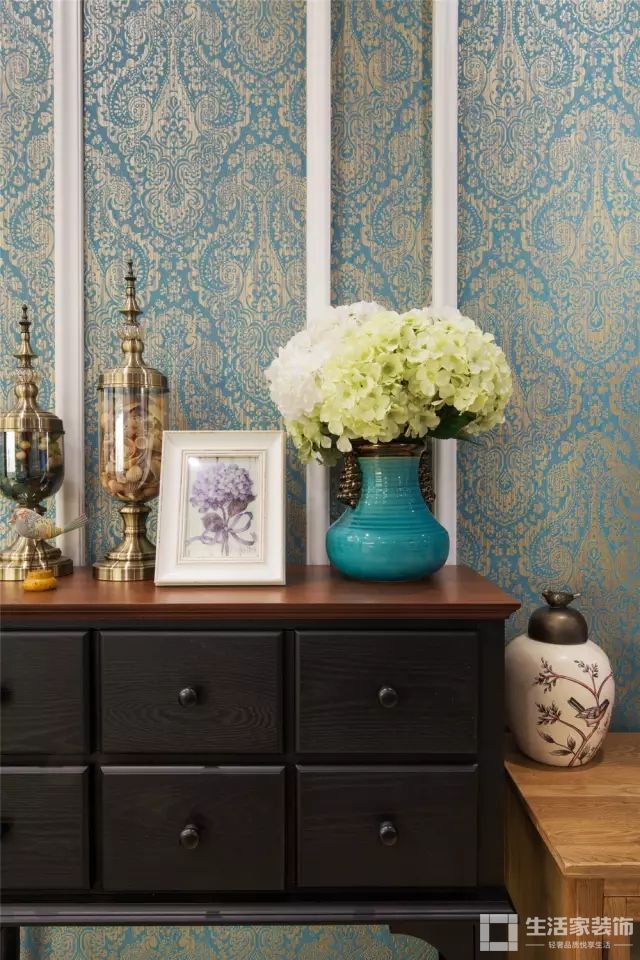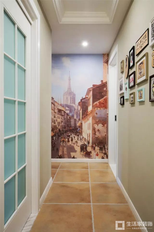 ▲过道的一面做了照片墙,这样空间会更有层次,走到底的墙选了油画效果的墙纸,与主体的色彩和风格也比较搭。