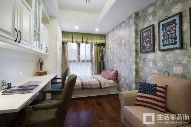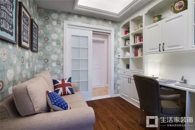 ▲换这个角度来看,这个房间的功能就一目了然了。已然是蓝白色调,不过墙纸选了更有细节和趣味的,让这个空间更活泼一些。