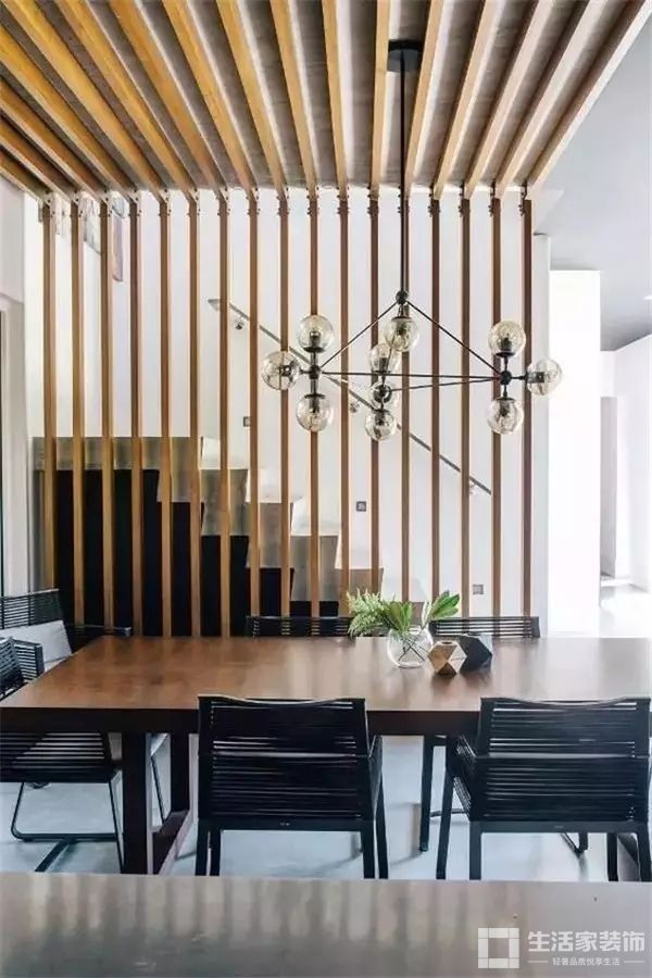 栅栏吊顶+栅栏隔断是所有隔断中最能扩充空间感的一种。它对空间户型的要求也不高,但如果空间越大,延伸的效果就越好。