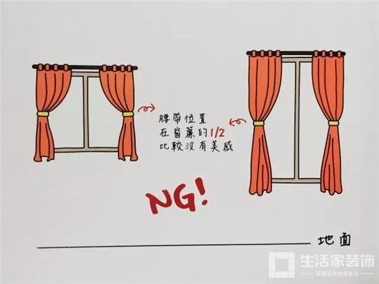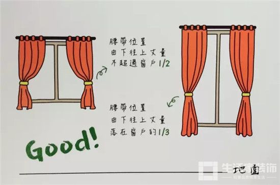 腰带的高度会影响窗帘的整体美观。通常我们以为的1/2高度,其实并不是最为理想的。长方形的窗户,腰带位置应在由下往上丈量的1/3处。