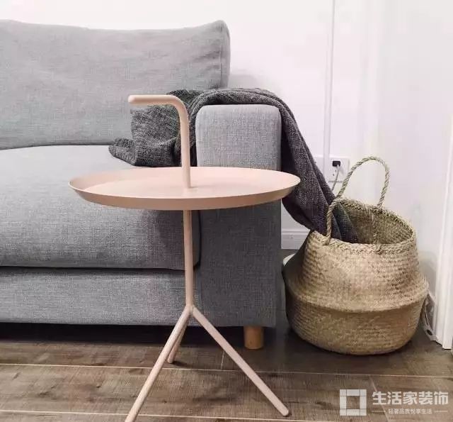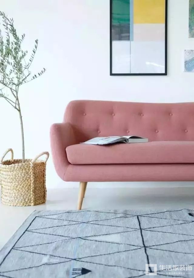 小粉的沙发使用木质的支撑腿可以融化你的心,配上灰色的地毯,默契度十足。