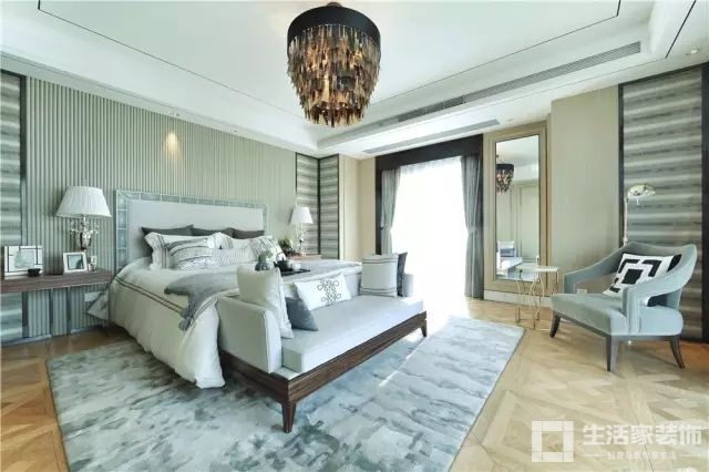 卧室:男主人希望在繁忙之余,在休闲空间身心可以彻底放松下来。所以卧室设计时天花也是简易线条元素处理,统一协调整体风格,灰蓝色+白色色调,搭配原木色的地板,安静而舒适。