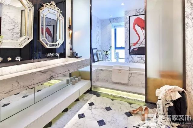 下一篇推荐:卫生间:整体采用高级石材铺贴,依旧是黑色边框线条加之钢化玻璃点缀,港式现代质感十足。欧式金质框边钻形双面洗漱镜,让空间既有品味有浪漫。