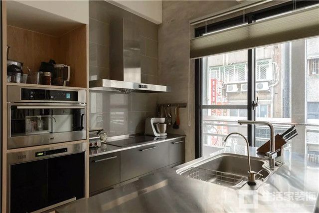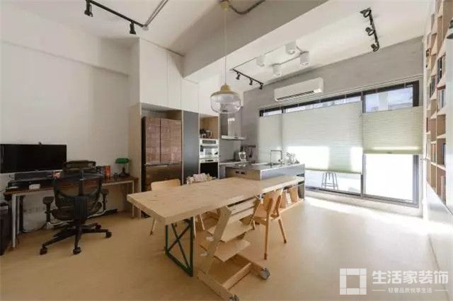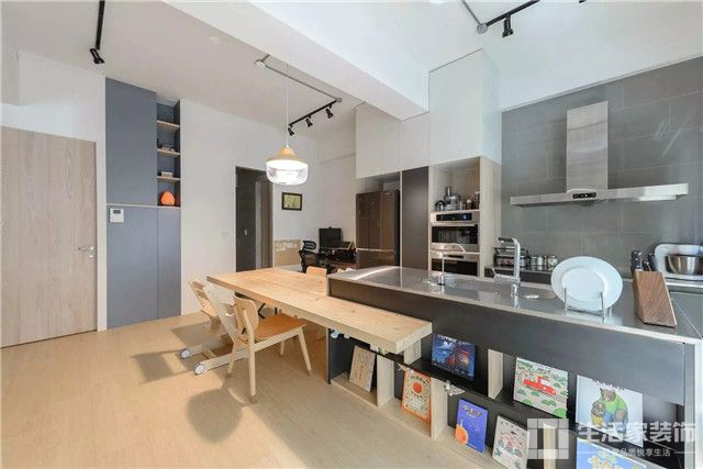 延伸不锈钢中岛加装长型木桌,这样一来就无需另外增设餐厅位置,不但可以在这里吃三餐,孩子需要桌面画图、阅读,也能同步在此进行。
