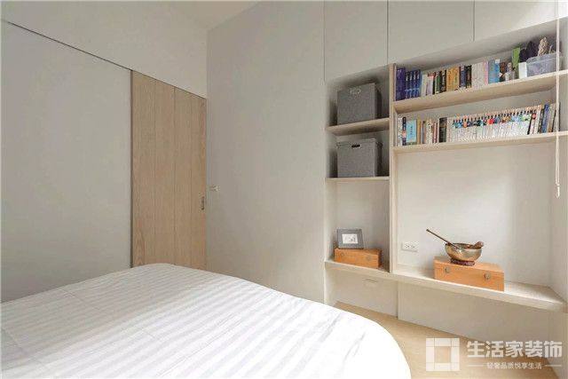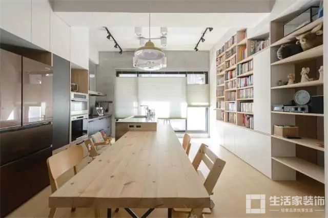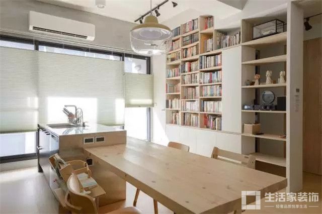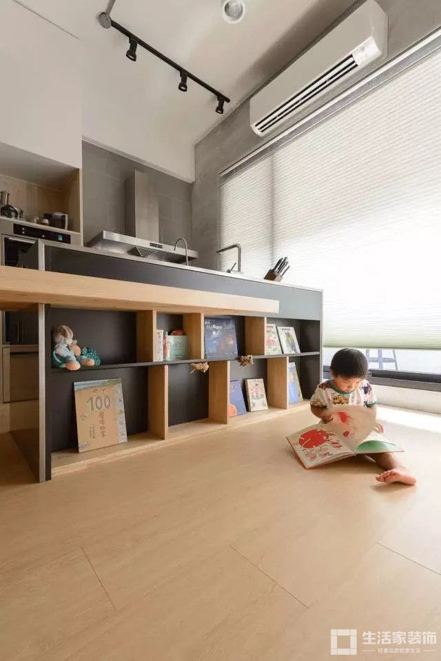 位于厨房的前方,也是一家人的阅读区也是孩子游戏区,除去眼前得大书柜,设计师特意为学龄前孩子规划出低位置书本摆放区,正好是方便拿取的高度,培养小朋友从小就爱读书的习惯。