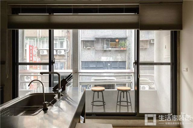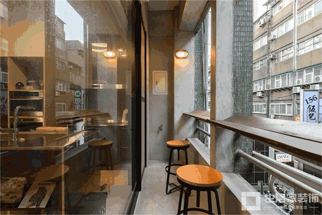 保留阳台位置,主要是为了降低户外噪音,保留一小块阳台区域,能有效隔绝声音。同时这里也变成男主人另一个雨天看景色的放松地点,栏杆加装木板,放置点心与饮料,独享私密午茶空间。