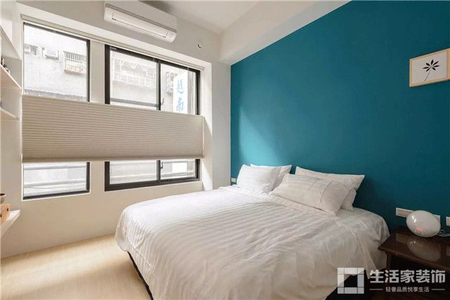 运用木头色配上蓝色营造沉稳氛围,回到房间有种解除压力的状态,由于空间较小,更衣室另外规划于和小孩房的中央位置,将全家人的衣物放在一起,更节省面积。