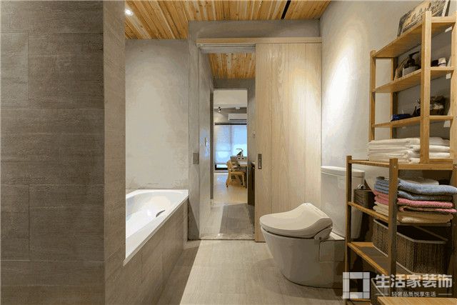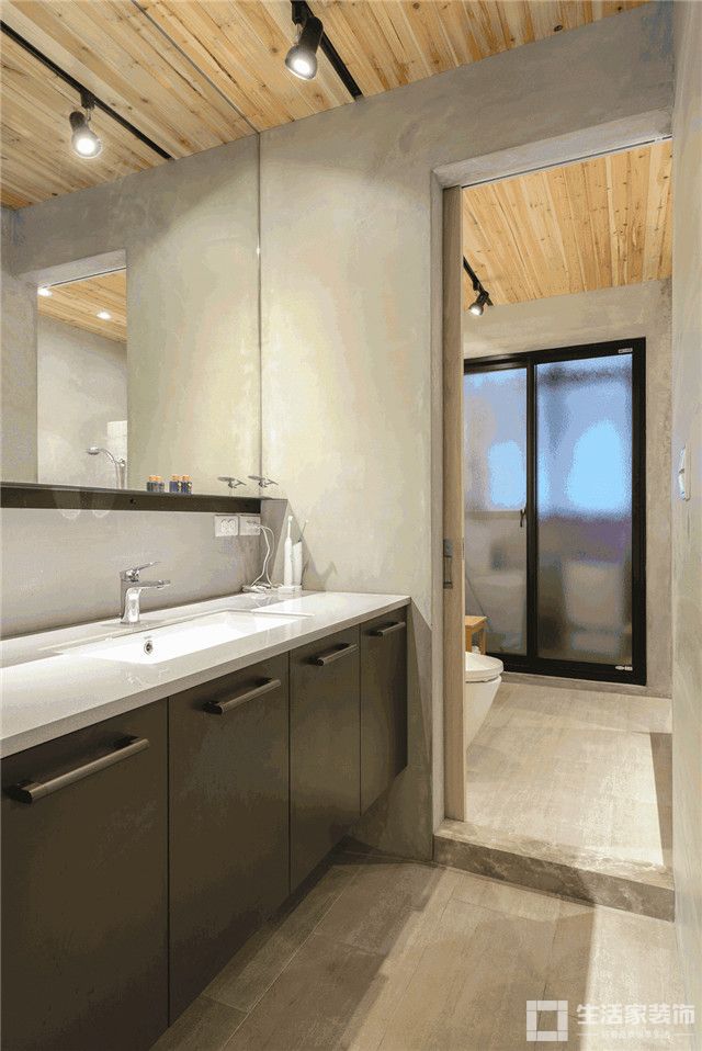 健明迪装饰提供的家里可以没有客厅,但不能没有核心区!,的人都会爱上这种客厅;浴室设计;;整合两间浴室并共用一个洗手台,客用卫浴仅有马桶配置,另一间则包含干湿分离卫浴与浴缸,使用水泥粉光、黑色磁