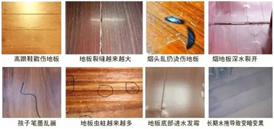 ▲缺乏保养的地板症状:其内部原因,往往和缺乏定期保养有关。此外也涉及到地板材质的含水率、表面漆膜质量以及预留伸缩缝的大小等问题。
