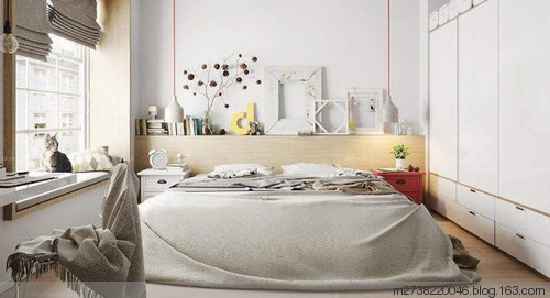 卧室中空间有限,那么就要合理运用每一个空出来的地方。比如床头柜上方的空间,几块木板就能创造出一个储物空间。常用的杂物都可以放在上面,如发卡、眼镜、装饰品等。