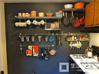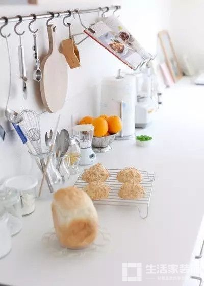 做好立面收纳。像这种空出来的墙面,浪费掉是非常可惜的,可以安装一些搁架、挂杆等等,厨具、餐具、调料瓶都可以直接上墙。想想这要是全部堆在桌子上,要占多大的地方……