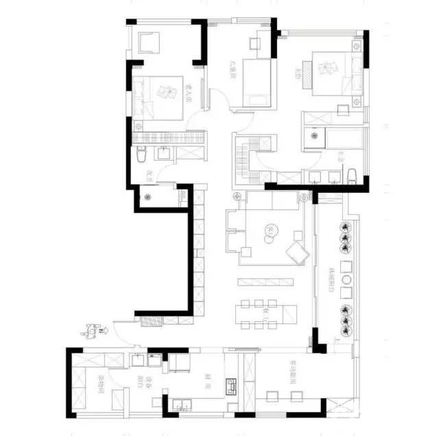 无论在哪个城市170㎡的面积都算是大户型的房子,就大小而言三世同堂居住绝对是没问题的,但是涉及到家庭未来的变化和孩子的学习成长问题还是得得好好规划才能让家既有利于孩子成长又能简洁开放不繁杂,这就需要在原有格局的基础上进行改造。把三间卧室移到同一边,中间为公共区域,另一边则是多功能房、厨房、阳台和杂物间,划分特别明确,简洁明了的功能区。