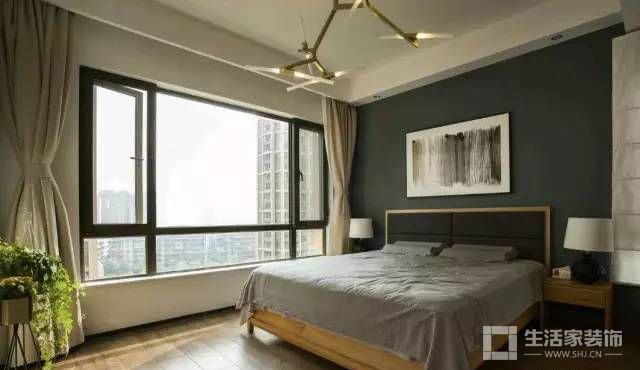 简洁的装饰,硬朗的线条,当然是同样有着酷酷性格的业主俩人的主卧,虽然非常喜欢这样的感觉,但是过于简洁的风格装饰让人觉得没有生活气息,于是乎就在清晨阳光最先照到的地方养了一个绿植,天天都精心呵护。