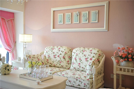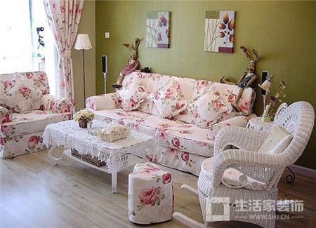 绿色的墙面很有自然气息,植物图案的装饰画能够与整体风格相协调,与沙发的花朵图案也形成了呼应。