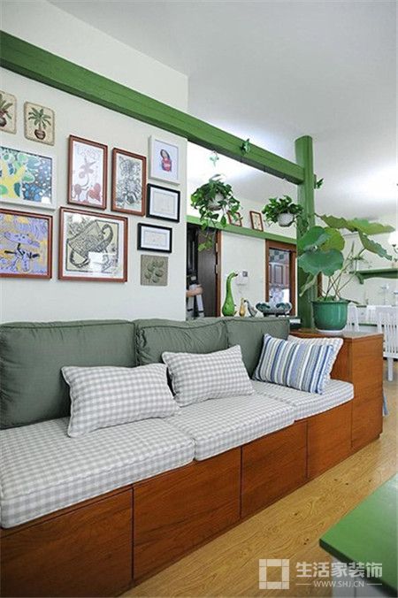 还可以把多幅装饰画设计成照片墙的形式,非常具有艺术感。绿色的横梁就像是田野中的葡萄架,非常休闲惬意的气氛。