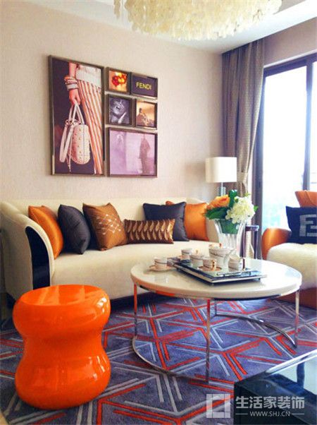 颜色鲜艳的沙发和凳子,以及大大小小色彩缤纷的装饰画,让这间客厅十分夺人眼球。装饰画抢占了绝大部分的视觉吸引力,是现代感和创意感最主要的来源。
