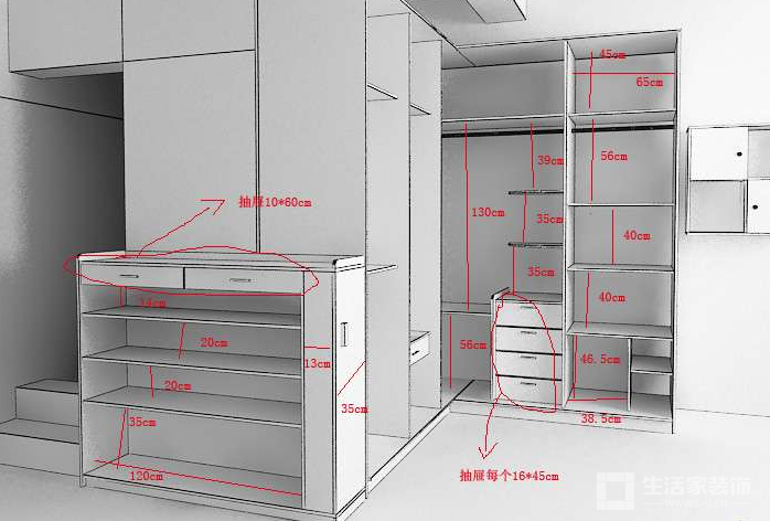 定制衣柜最重要的就是尺寸问题,这也是它的优点之一,整体衣柜的定制可以充分让你不能利用的空间被利用起来。一般来讲,单个柜体面宽通常为0.8m,2.2m高,进深如果是安装移动门需要0.65m,如果是合叶门只需要0.6m。柜体最好不要小于以上这些尺寸,避免挂衣服出现衣服时与柜门或柜体磨蹭的现象。
