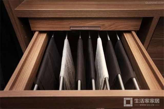 叠放的裤子会有折痕,而西裤架却能让裤子不留折痕,需要不少于600mm的悬挂空间,因此西裤架通常会放置在抽屉下面,这样更能节约空间。