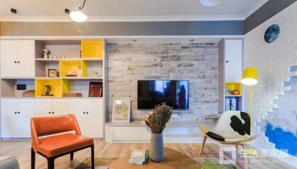 ▲进门,走过玄关,一侧就是客厅。白色破碎砖块做的墙面、水彩晕染感觉的地毯和染料四溅做成的装饰画,让这个客厅不那么中规中矩。