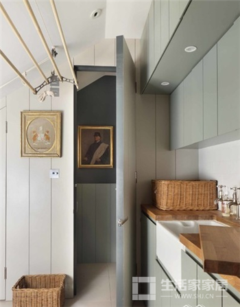 一定不能忘了墙边和天花板,墙面上做一排悬挂的橱柜,比落地的柜体更加节省空间,如果有杂物间有窗户就可以在靠近窗户的天花上安装升降晾衣架。既实用也不会浪费空间。