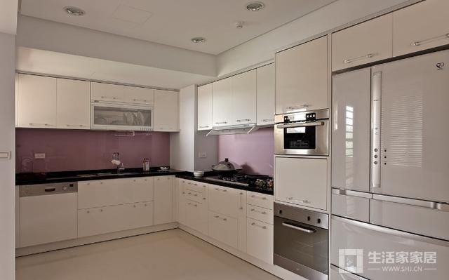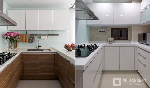 厨具和设备沿两个相邻的墙面摆放,理想配置是将洗涤区和烹飪区,分别设置在L型转角的两侧,或是把冰箱和洗涤区规划在同一墙面,形成完美的工作金三角,此格局灵活度高且适合配置中岛。