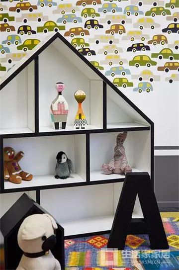 编辑点评:多个汽车图案“堆积如山”,让背景墙显得十分可爱、有吸引力;尖顶收纳架与背景墙图案外形相呼应,显得更和谐、统一。