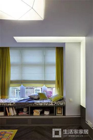编辑点评:儿童房内设置窗台软榻,增加了空间的舒适度,转角位置打造L型内嵌式片区,再加上灯槽设计,为窗台位置增加了亮度和营造了立体感。