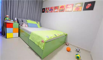 编辑点评:儿童房色调清新有活力,魔方外形的床头柜为空间增添了趣味和活力,床架底部开辟成为收纳柜也方便了玩具的整理。