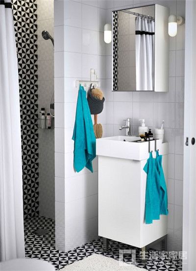 黑白配的瓷片,木质储物架,双人浴室柜,合理得运用空间,让浴室变得大起来。