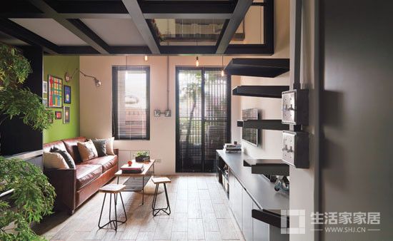 为了符合工业风的调性,空间感的营造是重点,在狭长型的格局中, 设计师尽量将量体 往两边放,保留中间的开阔感。在家具的装饰和搭配上,硬朗而随性的工业风气息也进一步蔓延。在地板的部分,选用刷旧感木纹砖,温润的颜色增强了空间的温度,细腻的纹路也让客厅的表情变得更丰富。