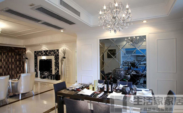 户型一小每个空间的面积也就随之压缩,也就可能会导致在室内出现视觉上的压抑感,在这样的情况下为了增加功能区的视觉空间,我们可以巧用镜面设计,一来起到装饰效果,二来可以利用镜面的反射效果增大空间感,使视觉上看起来空间不是那么的小,当然也因为镜面的反射问题,设计师一般也只建议将它做在客餐厅这样的“动”区就好,不影响正常休息。