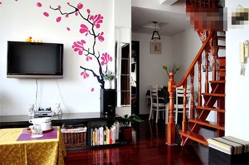 传统的电视墙 ,都是白色为主,单纯的色彩,并没有什么特殊的地方,如果在白色的电视墙上,贴上墙贴,深色的树枝,粉色的花瓣,随风飘落,散落在电视的周围,令整个电视墙变的田园味十足。