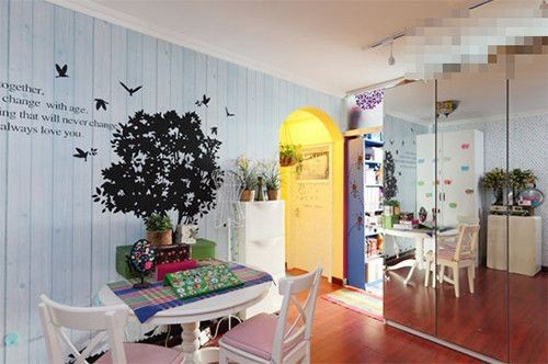 淡蓝色的木质墙板上,贴上黑色的字母风景画墙贴,虽然没有什么华丽的色彩,黑色的树枝,飞鸟,搭配字母,给整体淡雅的装饰带来了一抹清爽,自然之感,温馨中透出浪漫的小气息。