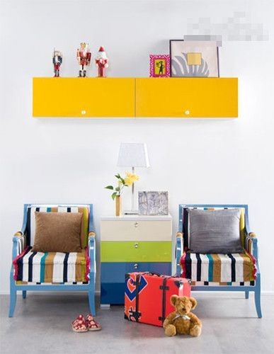 小沙发的上面,空白的墙壁处,凸显出来的部分,用亮黄色的木板打造了一个长方形的收纳柜子,两侧抽屉的样式,可以将一些小物品存放在里面,上面的部分还可以摆放上几个小玩偶,增加收纳性的同时也将小区域装饰