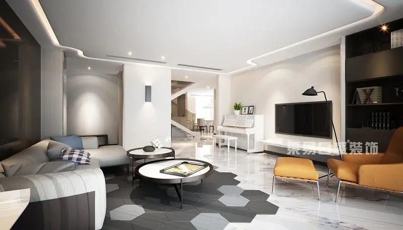 1.第一款欧式别墅装修效果图的设计中,我们可以看到这是一个客厅区的设计。这个客厅的旁边还带有一个小书房的设计,地面选择的是米白色的瓷砖,墙面是用的欧式花纹的米色墙纸,吊顶处是一个一级吊顶,然后用黑色的反光材料进行了包边处理,颇具现代风格的效果。它的沙发以及凳子都是使用的蓝色布料做的软包看起来非常具有欧式风格。电视机背景墙为了跟整个沙发相搭配,也是做了蓝色的格子的背景墙很有特色。书房也是一个开放式的书房。然后在书桌的后面打打造了一个很大的白色的实木书架,用来摆放一些书籍,非常实用。