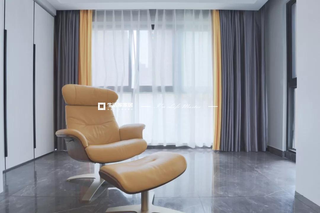 阳台放置了旋转沙发和脚踏,双向采光,便于阅读,阳台的左侧还有一组收纳柜,用来存放一些清洁工具和常用的衣物。