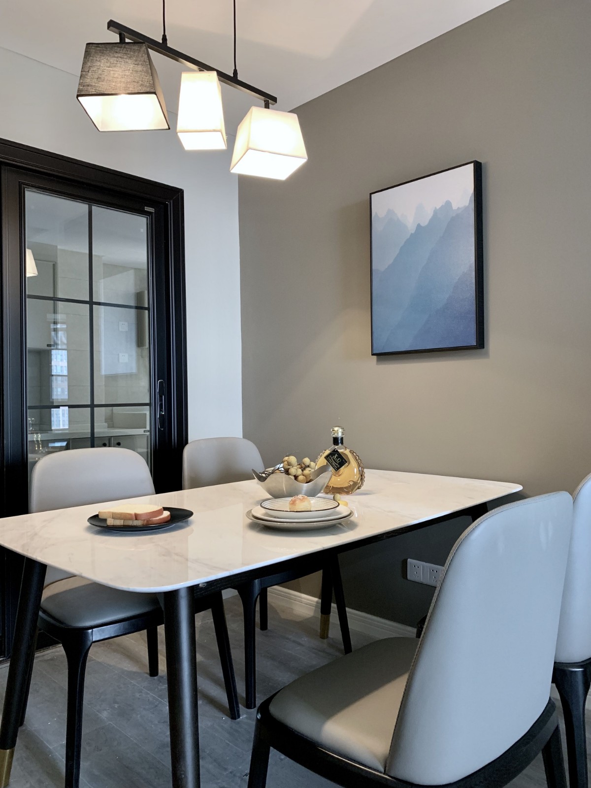 加上沙发和餐桌的选择,也更显得空间宽阔。虽然是黑白灰的基调,但辅以深浅不一的蓝色来装饰,带来了质感和家的温馨感。