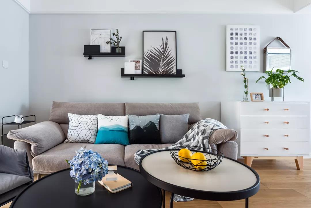 很喜欢墙面的置物架设计,摆放些艺术画特别合适。一旁的斗柜兼具多种功能,好看又实用。