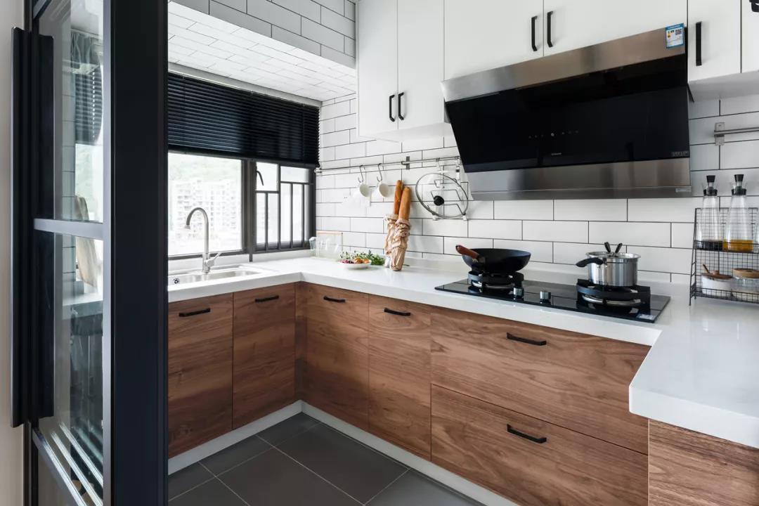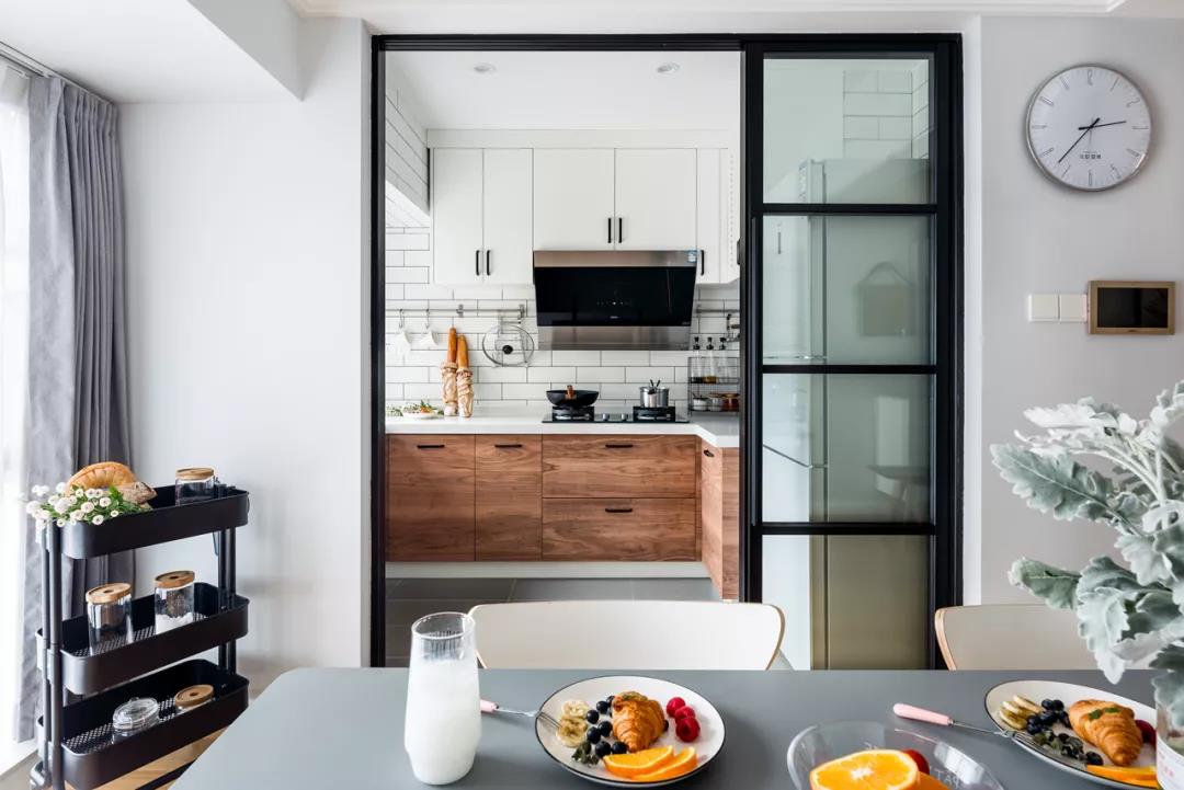 厨房用玻璃门进行隔断,可以有效地隔绝油烟。里面是U型布局,分区十分合理。原木色的储物柜和白色吊柜形成对比,让厨房不会显得那么冰冷,地面砖选用了哑光灰色的大理石纹理砖,耐脏同时便于打理。