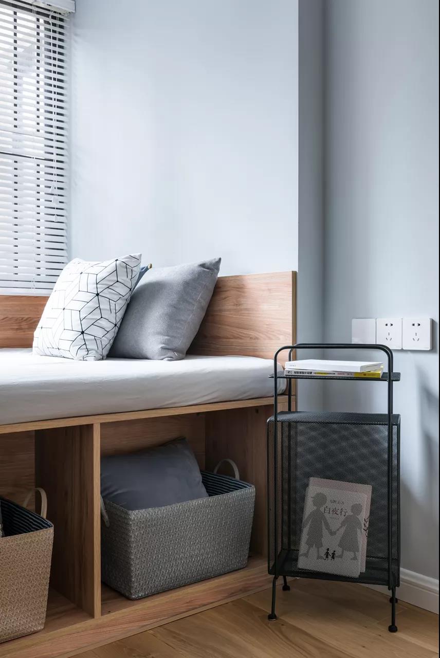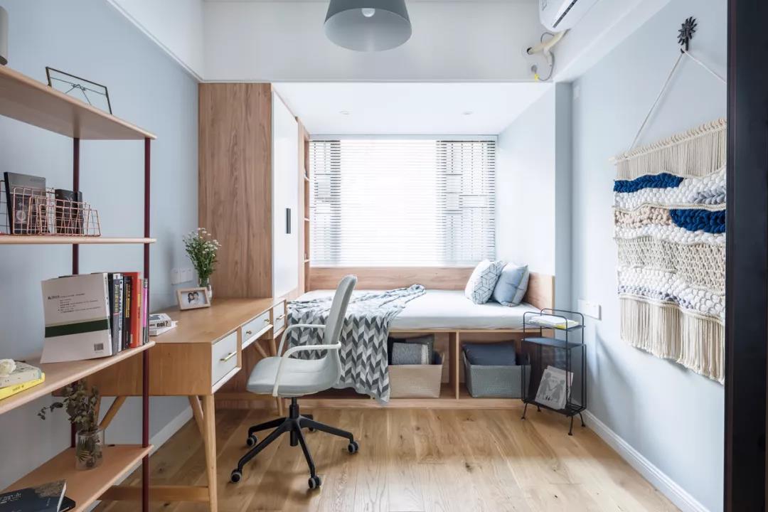 次卧是榻榻米组合收纳柜的设计,然后留出位置摆放书桌和书架,让空间得以充分利用。
