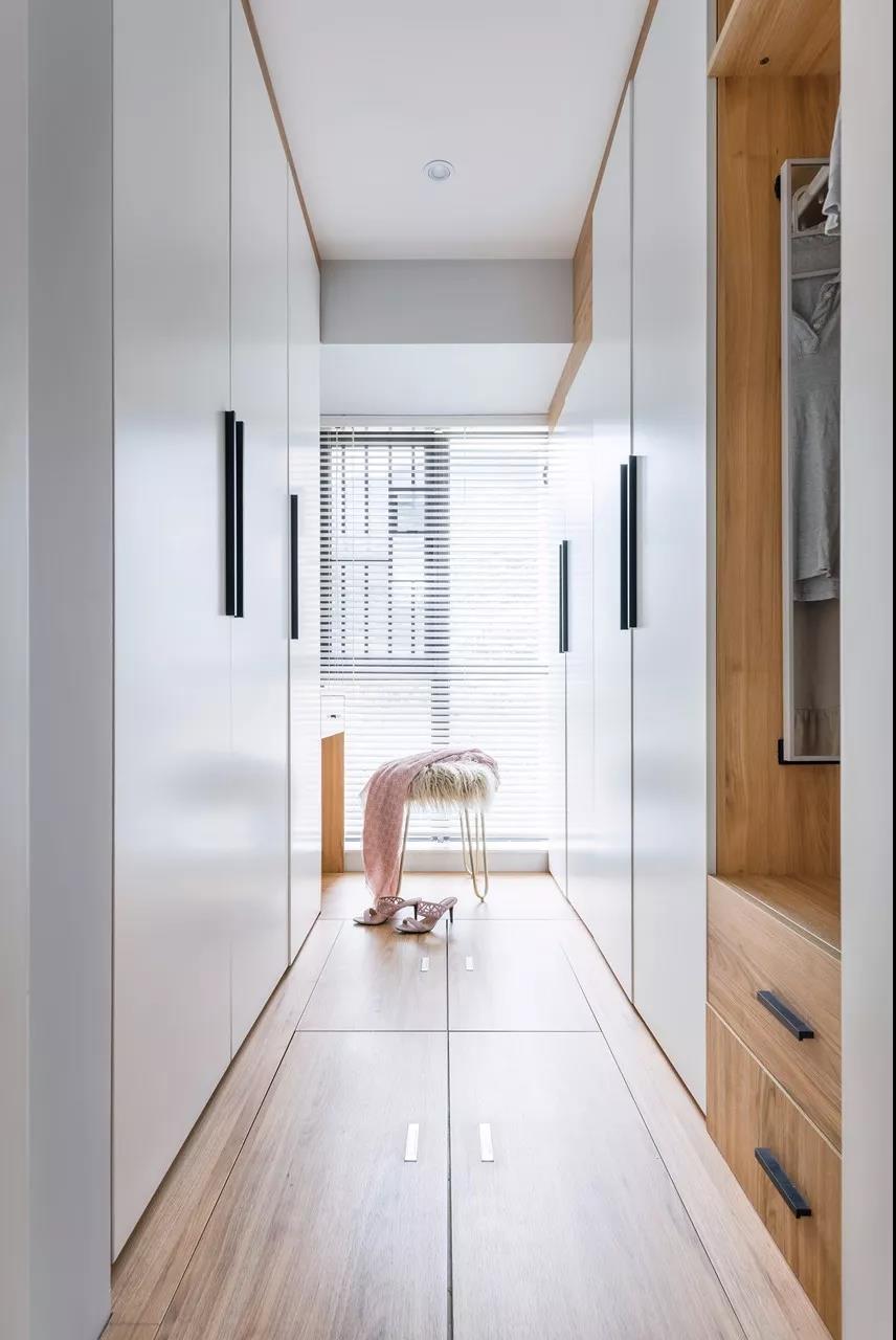 主卧和书房中间有个大衣帽间,除了两侧的收纳柜,还有地柜设计,储物能力非常强大。落地窗保证了空间的采光通透性。梳妆台也巧妙融入其中,颇为实用。