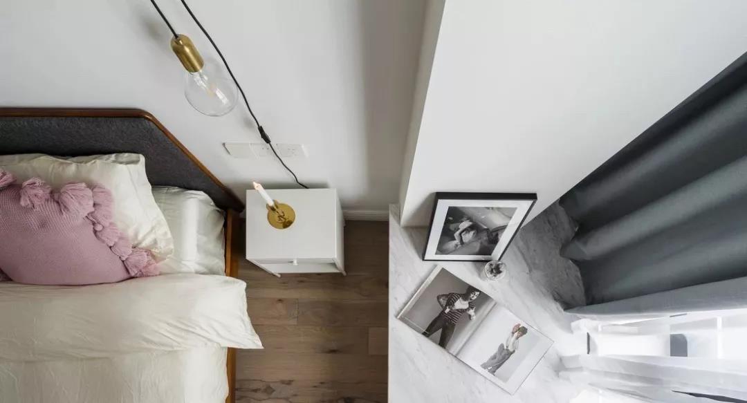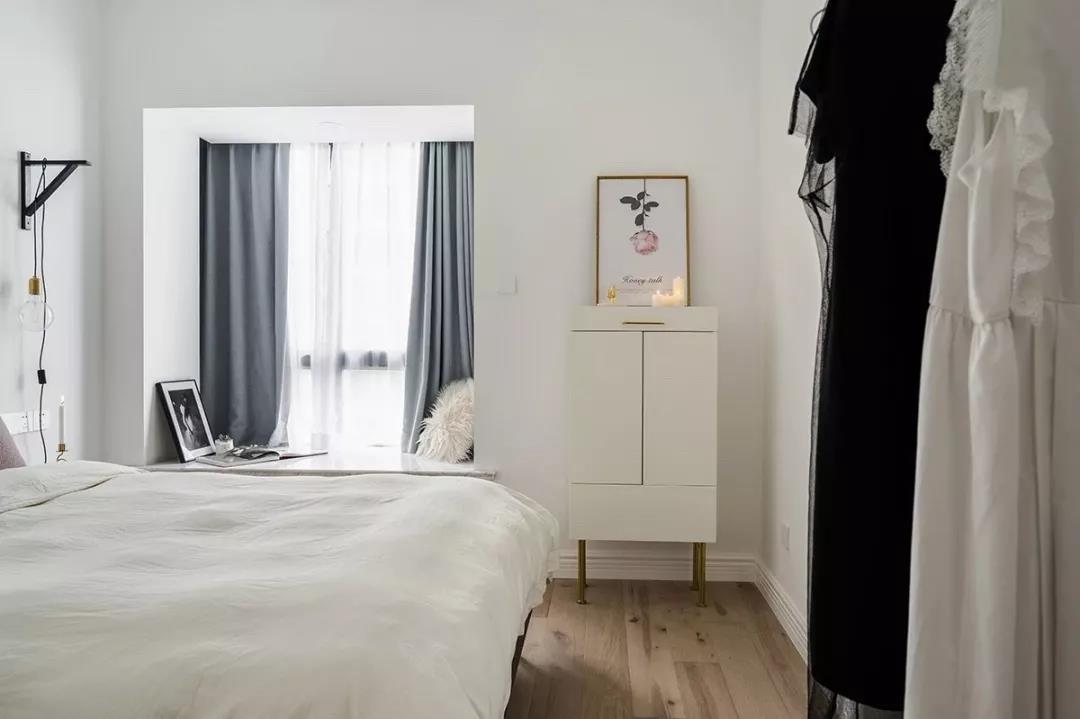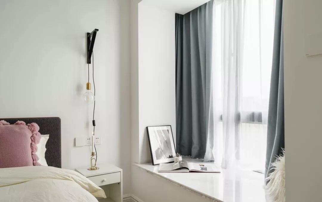 纯净简洁的北欧风,灯具一般不会太复杂,这里床头的小吊灯设计师加入了金属的元素在,整个给人高级的格调。你可以看到卧室的一旁还设置了一个飘窗,闲暇时可以一边享受阳光,一边坐在上面看书,写意生活。