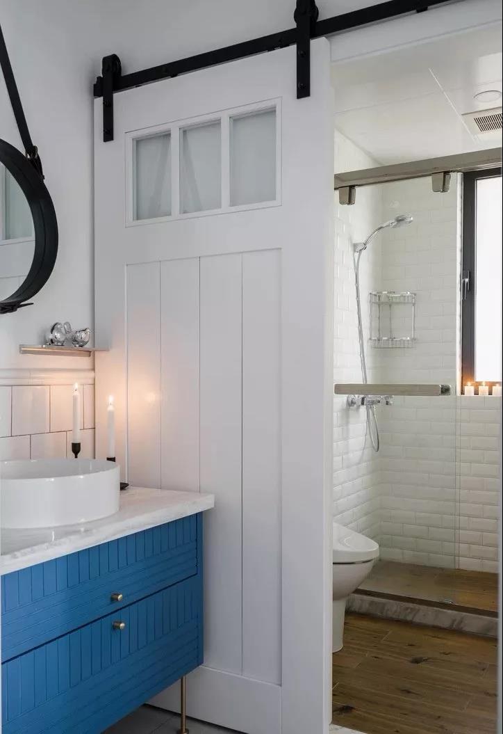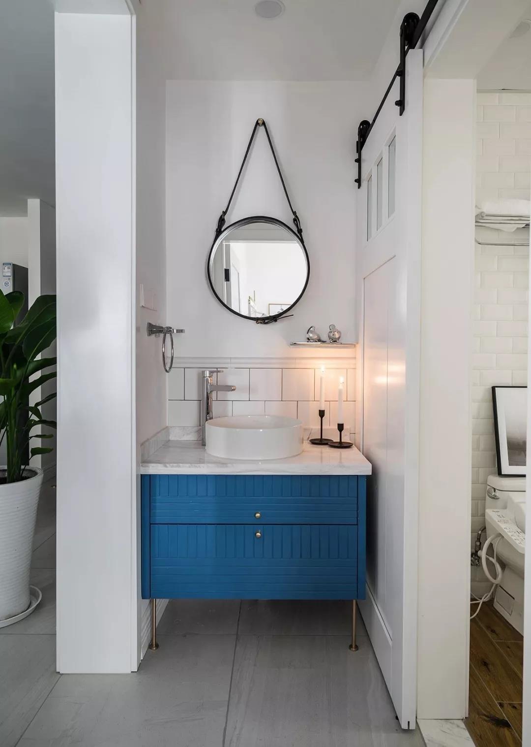 无处不在的色调呼应,以及相同元素的材质选择,极其纯净的色彩组合都让空间的秩序特别的规整。蓝色的台盆柜配上精致的金色配件,显得更加的精巧时尚。