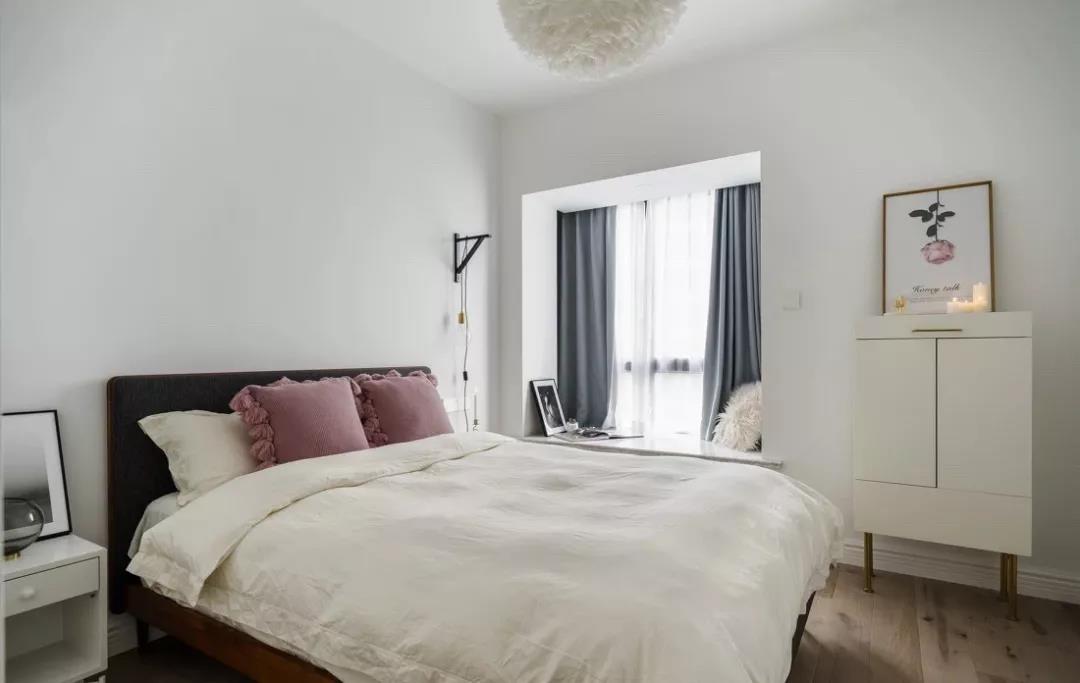 卧室简单干净舒服,大面积以白色系为主,搭配高级的粉抱枕和装饰画,温馨又有情调整个给人清新脱俗的感觉。