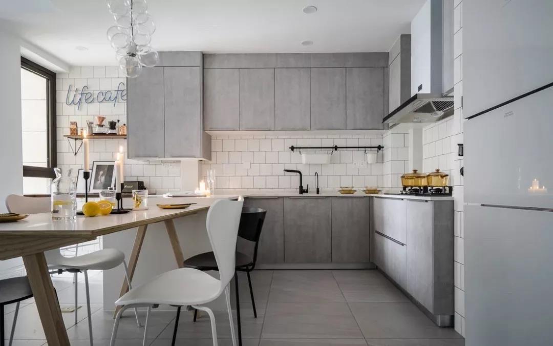 设计师特意在原始厨房的旁边开了一个落地窗,能够很好的把自然光源投射进室内,厨房也更为明亮跟舒适。橱柜门板采用双饰面的水泥面板,小白方砖错位铺贴,拉开整个空间的层次感。