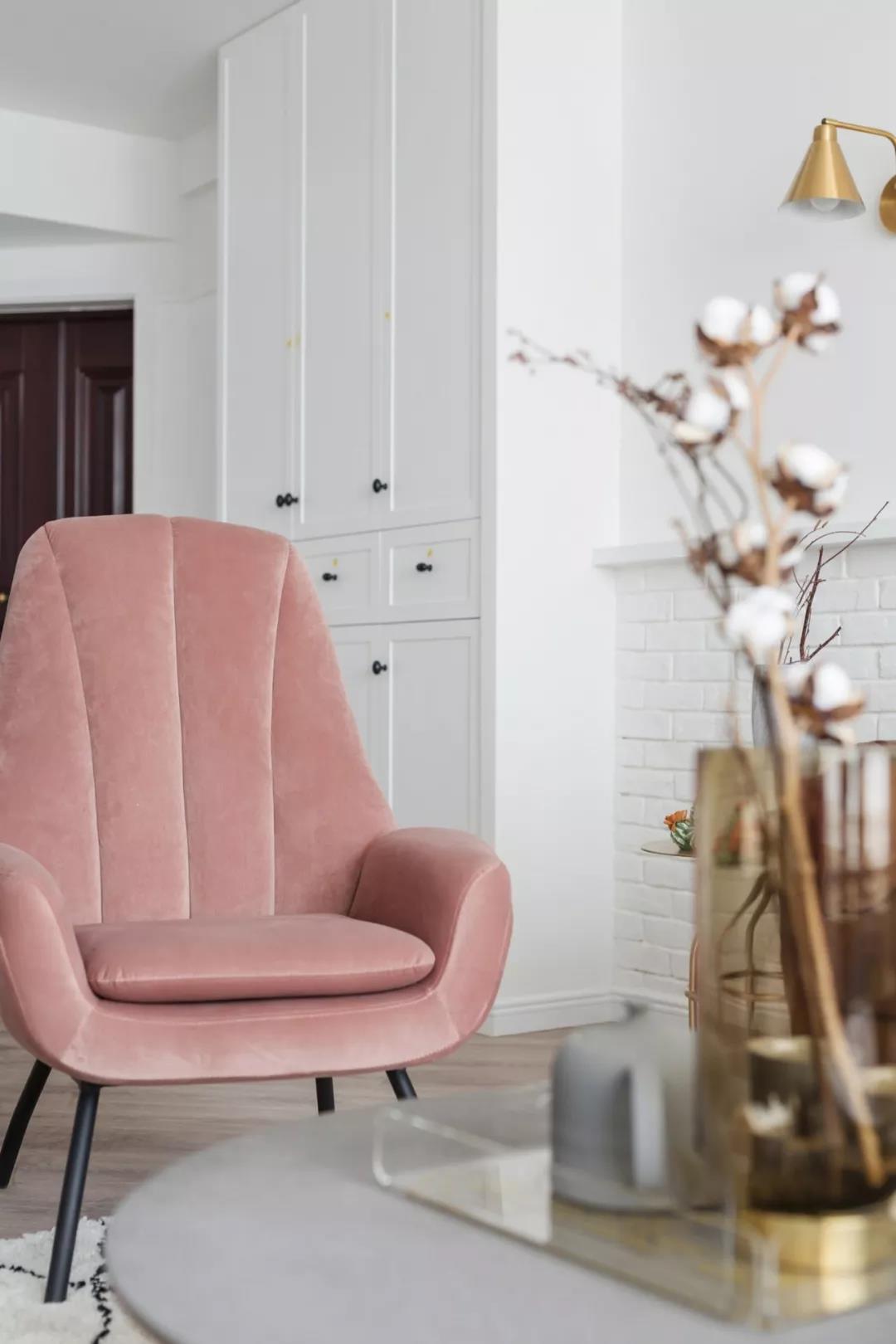 粉色的天鹅绒扶手椅前随意摆放的地毯,营造出休闲惬意的气氛,似乎只要躺上去,时间也会相对走的比较慢一些。
