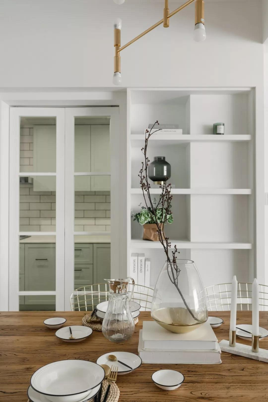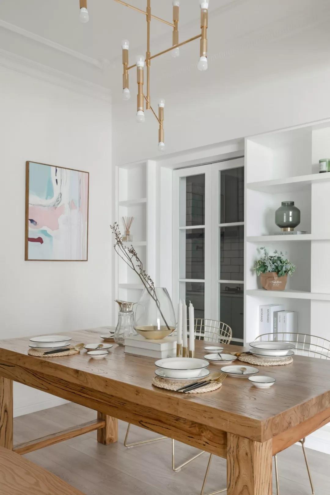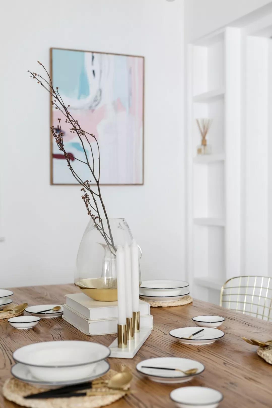 北欧风秉持着追求极简生活的理念,在家具方面,尤其是一些小的挂饰和摆件上面都会以简单、自然、清新为主,具有艺术感的黄铜吊灯,与餐桌上的黄铜器物相互呼应,统一白色的餐具搭配黄铜,用餐环境纯净且带高级质感。
