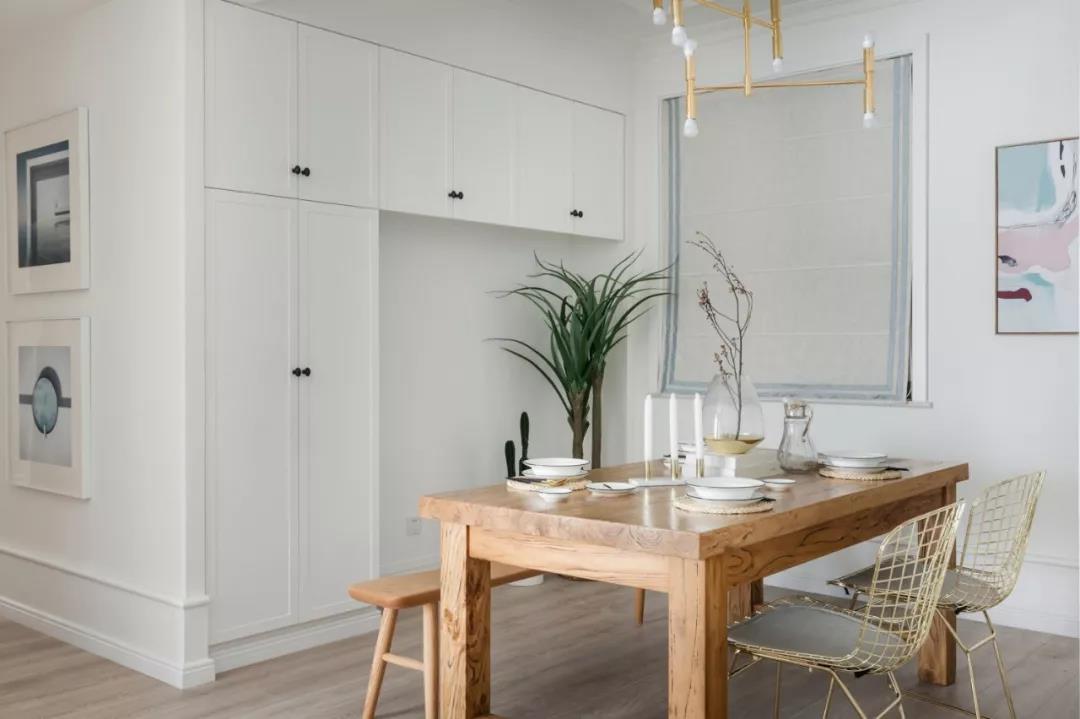 无论是墙上的装饰还是柜子、隔板上的摆放物,都简洁而朴素,却也能够恰到好处的起到点缀房间的作用。带有怀旧情感的长条椅凳,搭配2张金属镂空的餐椅,混搭风天然而成。