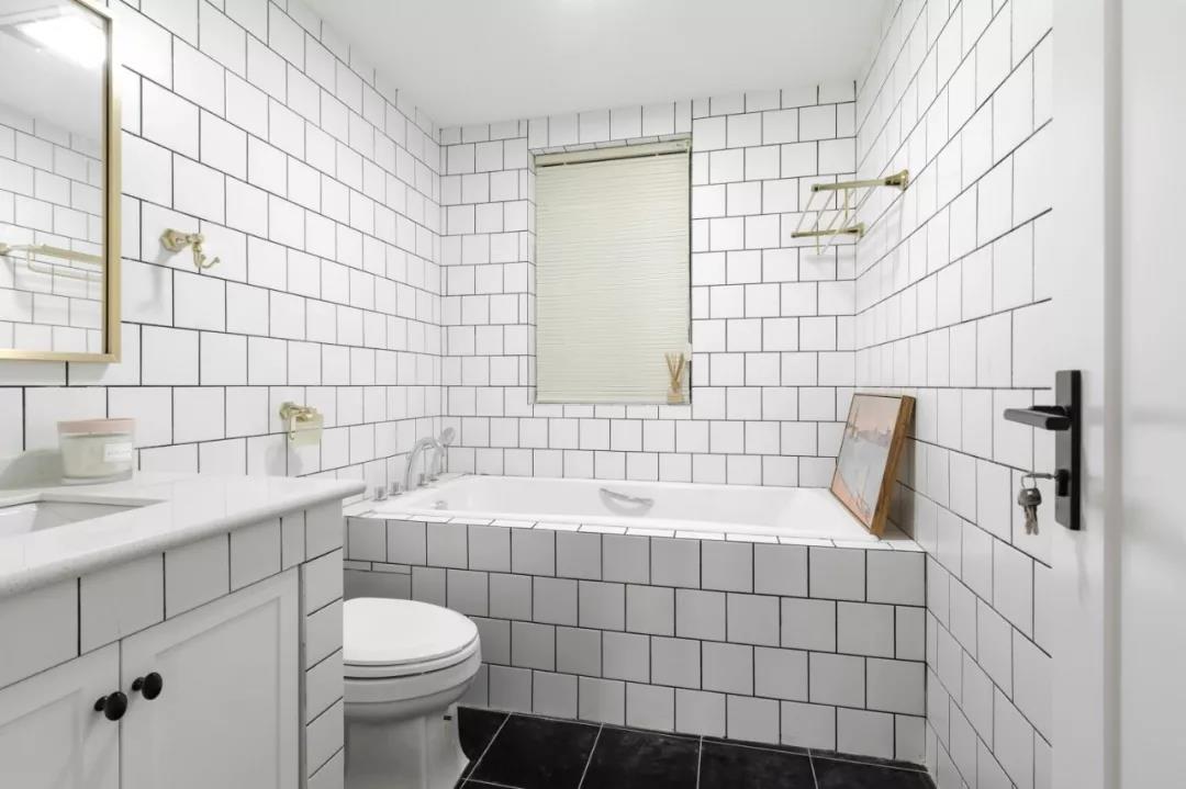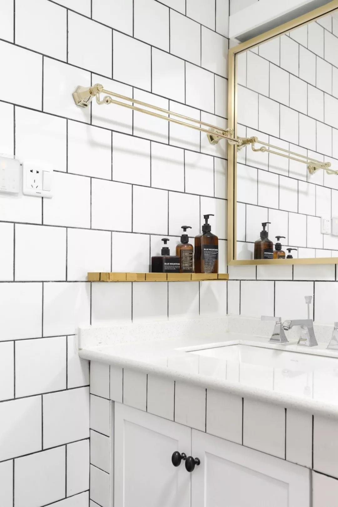 卫浴间整体采用白色小方砖,黄铜做装饰,统一的色调从视觉上扩大了空间感,还更显得整体干净。